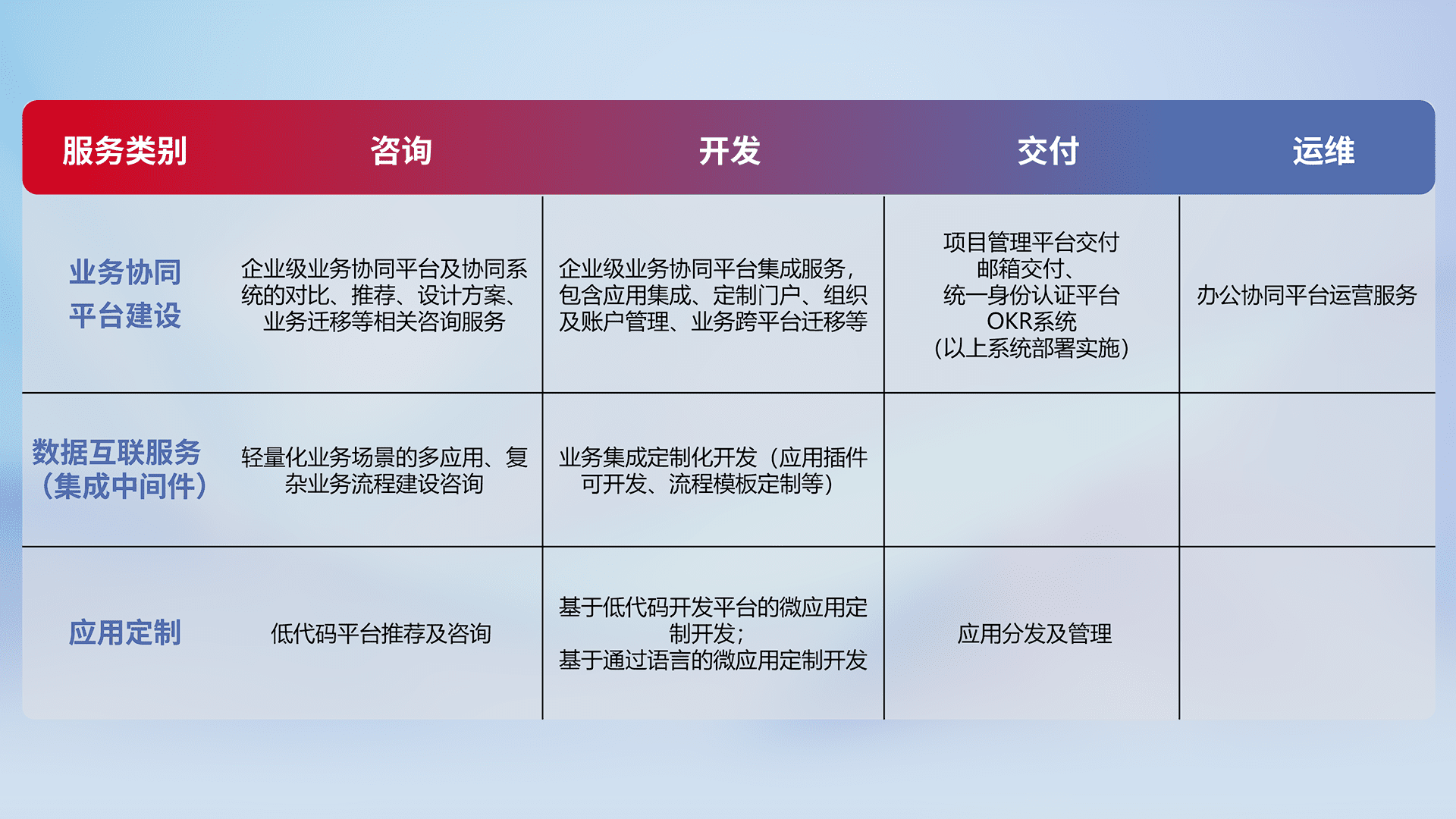 针对钉钉、、、企微、、、IDaas等平台级产品提供产品的规划、、、方案、、、、交付、、、、定制化开发等服务,,实现如统一协同办公、、、智能客户服务、、、混合会议管理、、智能数据查询、、等业务场景,,实现数字化转型。。