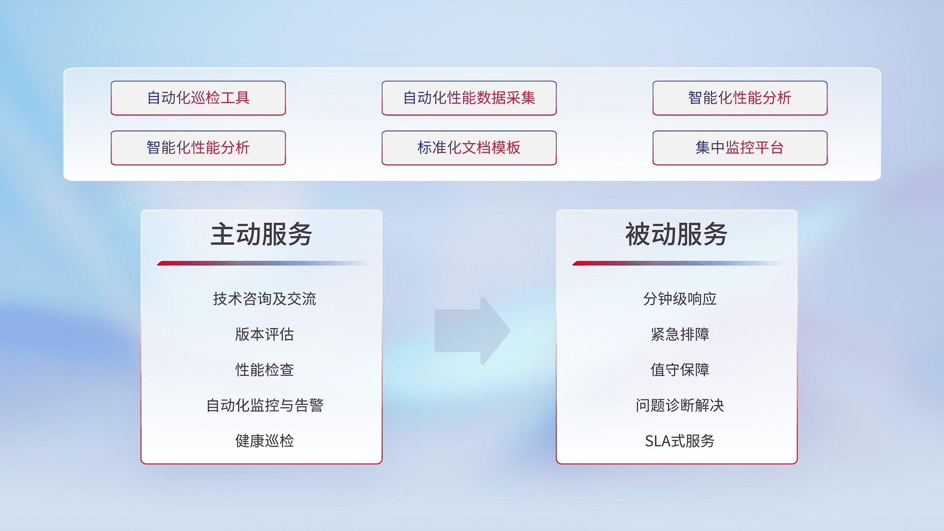 智能化工具和标准化文档,,,保障服务质量,,提供主动服务(包含技术咨询、、、版本评估、、性能检查、、自动化监控与告警、、健康巡检)和被动服务包含(分钟级响应、、、紧急排障、、、、值守保障、、问题诊断解决、、SLA服务)。。